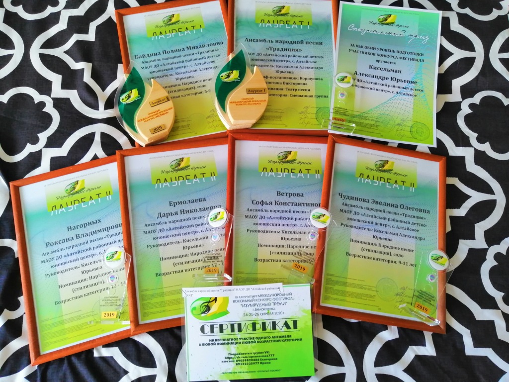 В апреле 2019 года в городе Белокуриха прошел Международный вокальный конкурс «Изумрудные трели». В числе участников были Республика Алтай, Кемеровская, Новосибирская, Томская область, город Барнаул, Бийск, Рубцовск. Из Алтайского районного детско-юношеского центра в конкурсе принимали участие воспитанники театра песни и танца «Сюрприз» Акимов Данил и Окс Владимир, воспитанники ансамбля народной песни «Традиция»: старшая группа, средняя группа, Ансамбль народного танца Коршуновой Кристины Викторовны, солисты ансамбля «Традиция» Ермолаева Дарья, Нагорных Роксана, Чудинова Эвелина, Ветрова Софья, Байдина Полина. В составе жюри конкурса приехали ведущие специалисты в области вокального искусства: Щербакова Ольга Семеновна, г. Барнаул. Кандидат педагогических наук, доцент.Заведующий кафедрой народного хорового пения Алтайского государственного института культуры.,Горелова Мария Евгеньевна, г. Москва.Приглашённая солистка Государственного академического Большого театра России. Лауреат Международного конкурса вокалистов им. М.И. Глинки. Призёр слушательскихсимпатий радио классической музыки "Орфей". Лауреат международного конкурса им. Винченцо Беллини (Италия 2010). Член Союза Музыкальных деятелей России, Николаева Ольга Сергеевна г. Новосибирск. Преподаватель эстрадно-джазового вокала. Среди учеников - обладатели гран-при Российских и международных конкурсов, участники проектов «Детское Евровидение», «Голос. Дети», «Детская Новая волна». Солистка группы «WeekAnd»(jazz/pop/soul), дуэта «Nikolaeva&Zaytseff» (pop/lounge). Воспитанники ДЮЦ успешно выступили на конкурсе и получили заслуженные награды: Акимов Данил – Лауреат II степени, Окс Владимир – Лауреат II степени, Байдина Полина – Лауреат I степени и кубок фестиваля, Ансамбль «Традиция» с вокально-хореографической постановкой «Масленичный разгуляй» - Лауреат I степении кубок фестиваля, Чудинова Эвелина – Лауреат II степении кубок фестиваля, Ветрова Софья – Лауреат IIстепении кубок фестиваля, Нагорных Роксана – Лауреат IIстепении кубок фестиваля, Ермолаева Дарья – Лауреат IIстепении кубок фестиваля. Дополнительно, ансамбль «Традиция» получил от жюри конкурса сертификат на бесплатное участие в конкурсе в следующем 2020году. Педагог ансамбля «Традиция»,Кисельман Александра Юрьевна, получила специальный приз конкурса, кубок фестиваля, диплом и благодарность за высокий уровень подготовки участников фестиваля. Педагог по вокалу Женина Лариса Леонидовна и Хореограф-постановщик Коршунова Кристина Викторовна получили благодарственное письмо за достойный вклад и популяризацию и развитие музыкальной культуры. Поздравляем воспитанников и педагогов, желаем дальнейших успехов!