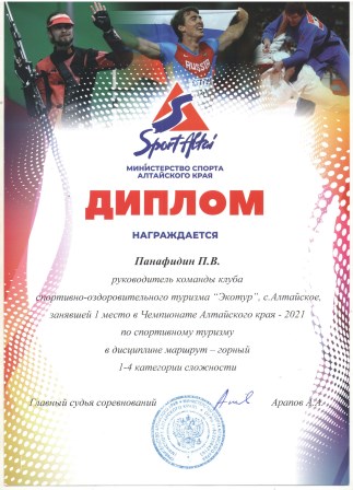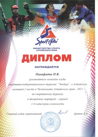 Команда клуба спортивно – оздоровительного туризма «Экотур» награждена высокими наградами: Диплом и кубок 1 место, Диплом и кубок 2 место Чемпионат Алтайского края – 2021 по спортивному туризму в дисциплине маршрут – горный 1 - 4 категории сложности.