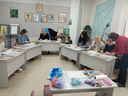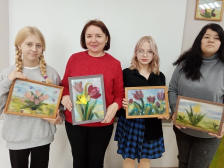 Татьяна Сергеевна познакомила ребят студии с интересной нетрадиционной техникой, возможностью смешения цветов шерсти, способах работы, помогла участникам мастер-класса быстро освоить навыки и выполнить творческую работу «Тюльпаны».