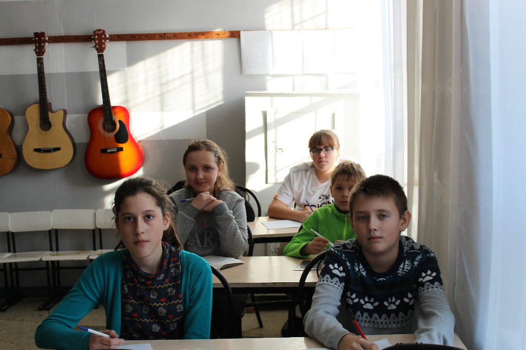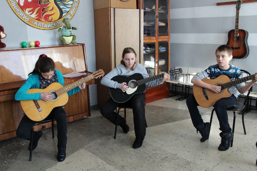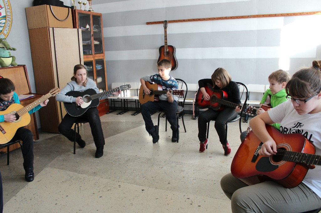 На занятии ребята увлечённо осваивали инструмент гитара, приобретали умение элементарного звукоизвлечения, отрабатывали положение правой и левой руки при исполнении упражнений. Также овладевали начальными двигательными и игровыми навыками:игра ровным звуком,простые переборы,свобода исполнительского аппарата,постепенное подключение большого пальца,изучение техники боя, простые аккорды,чередование басов и аккордов.