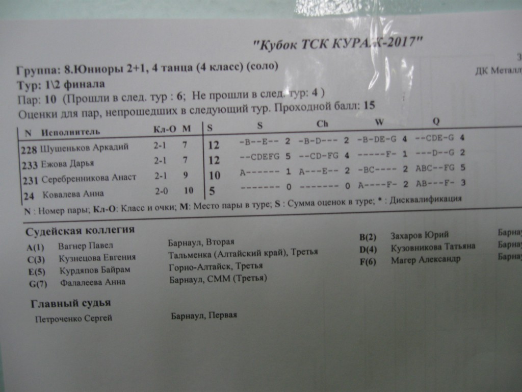 5 февраля 2017г. воспитанники детского театра песни и танца «Сюрприз» успешно выступили на межрегиональном турнире на кубок танцевально-спортивного клуба «Кураж» в г. Заринске. На турнир съехались танцоры Алтайского края и Республики Алтай. В своей возрастной категории на вторую ступень пьедестала поднялись пара: Налимов Тимофей, Серебренникова Анастасия. Третье место заняла пара Шушеньков Аркадий, Чемина Полина. Наши танцоры в финале пропустили только пару из Барнаула. Поздравляем педагога Клиновицкую Надежду Сергеевну и наших медалистов с заслуженными наградами.