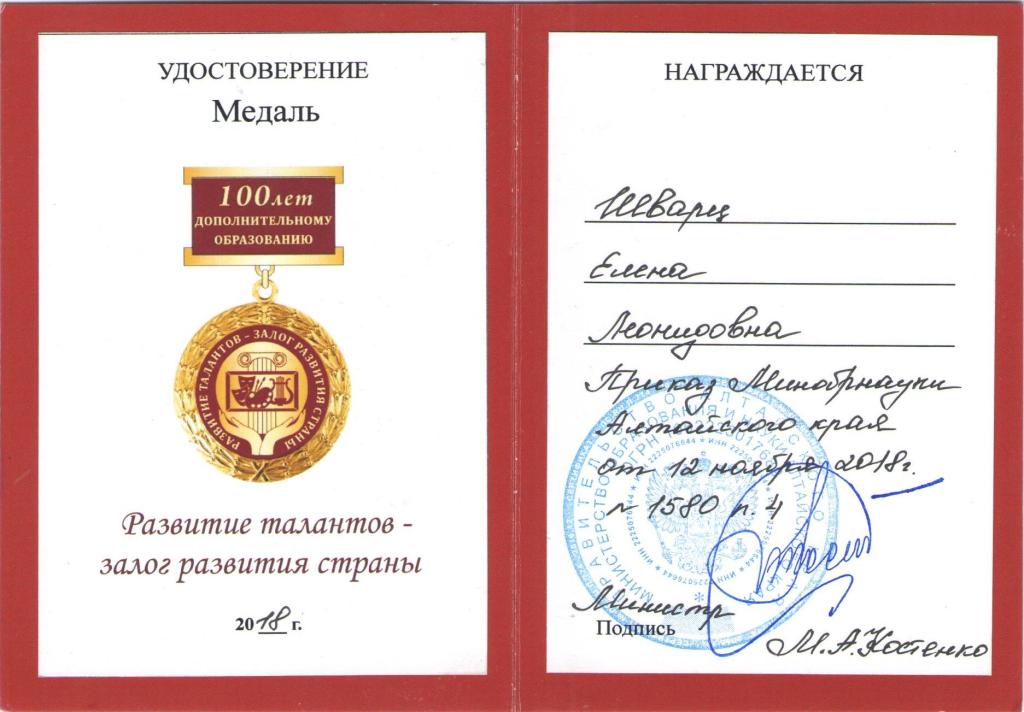 Удостоверение Медаль 100 лет дополнительному образованию